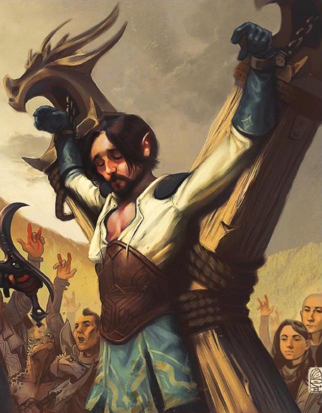 Zelena agrees then quietly slips out of the tent with Issa as a black cat. They head toward the cave. The sun has set, so the camp is now illuminated by lamps every 30 feet. It is easy for them to keep to the dim shadows until they round the last corner and can now see behind Rezmir’s tent. An elf with long hair wearing bracers and leather armor is strapped to wooden poles with his head hanging down. Three drakes sit at his feet. After a moment, the pavilion flaps open to reveal a dragonborn with deep black scales. She carries a scowl on her face and a turkey leg in one hand. She wears gold-trimmed purple robes and marches over to the exhausted elf, “I bet you are getting hungry. Let’s try this again, how long have you been watching our camp? Who do you work for? And how did you know my name?” She takes a big bite out of the leg and chews it louder than is necessary in polite company.