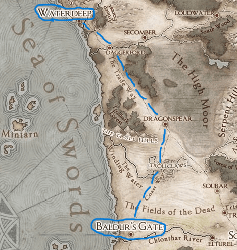 Last night, the party met Charlie, a local Dragon Expert in Baldur’s Gate. He discerned that two of the three eggs they stole from the Cult of the Dragon had died in Zelena’s (elf wizard) bag of holding. The third egg was barely alive, and the group agreed to leave it with Charlie to raise. During the night, however, Phoebe (human paladin) took it upon herself to execute justice on this unborn baby black dragon. She was told black dragons are born evil, so she believed she was saving the world before the problem began. Vola (half-orc wizard) witnessed this betrayal from the shadows and called her out. After a brief fight, Nimby (gnome ranger) arrived on the scene very confused. Without hesitation, Phoebe blamed Vola for the death of the dragon. Vola fled the scene, and was subsequently captured by Rezmir, a high ranking cultist, who was seeking her after she deserted the Cult of the Dragon. Zelena and Issa (tiefling druid) rejoined the group to learn Vola had betrayed them and left. After a moment to mourn the dragon, the group decided to continue with the mission to follow the Cult of the Dragon up the Coast on a trade caravan.